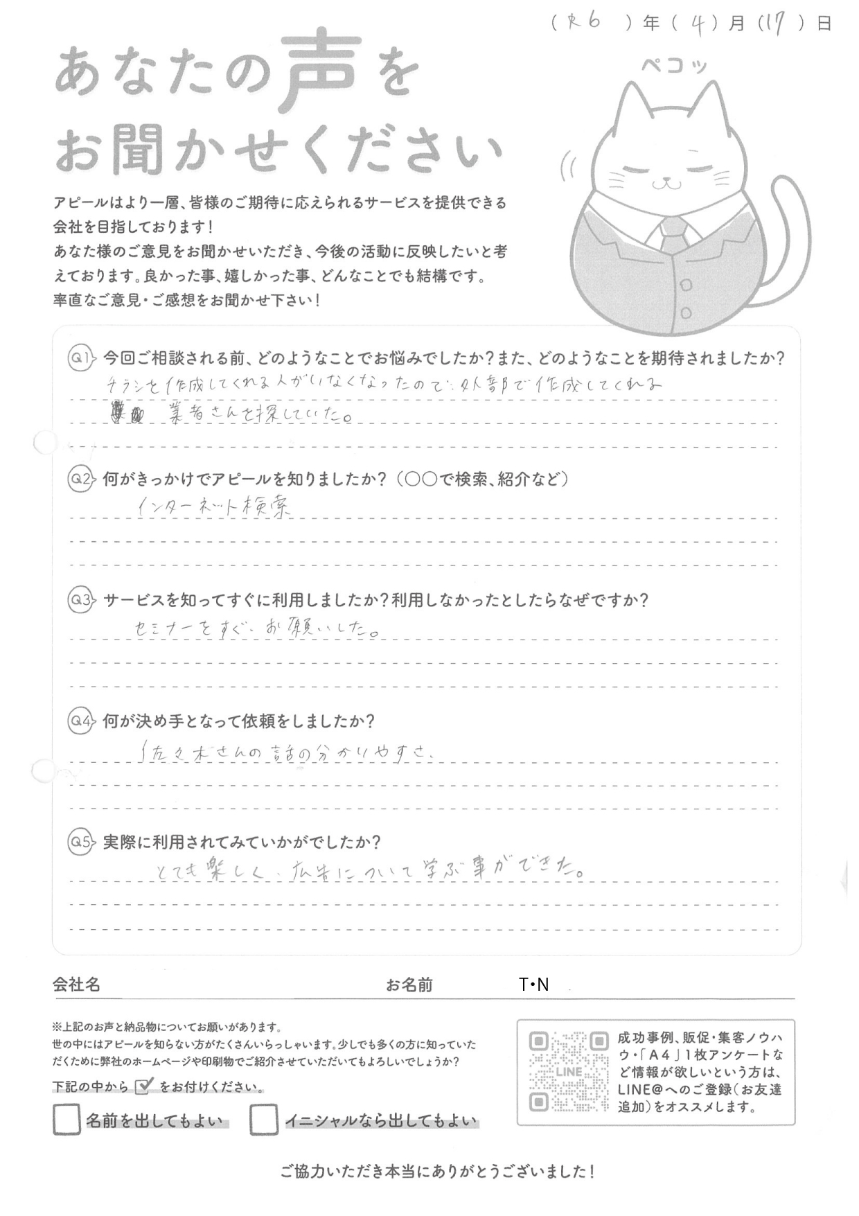 とても楽しく広告について学ぶことができた。 T・N様